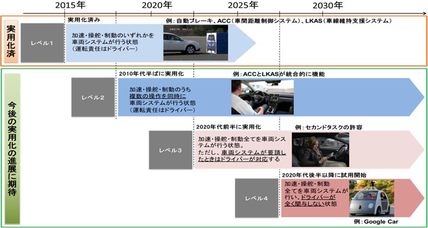 わが国の自動走行の将来像については、2014年6月に IT総合戦略本部によって決定された「官民 ITS構想・ロードマップ」において自動走行が実用化される予定の時期を発表している(図4)。
