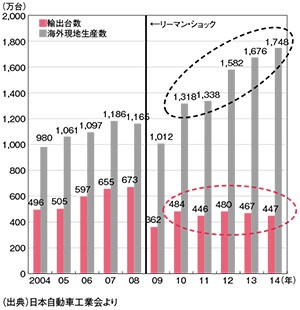 日本の自動車メーカーの生産体制については、過去20年間の構造的な変化として、海外生産が増加しており、最近ではリーマン・ショック後にこの傾向が加速している(図2)。2012年以降は円安傾向の中で、幾つかの自動車メーカーが国内生産を増加させる動きがあるものの、海外での需要増をおおむね現地生産で対応していくという「地産地消」という各社の戦略の影響が表れているものと考えられる。