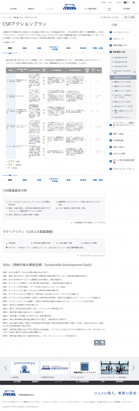 伊藤忠商事は「三方よし(売り手よし、買い手よし、世間よし)」という近江商人の精神を継承し、ビジネスを通じて社会的な課題解決に貢献するという考え方をTOPが発信している。2014年にはコーポレートメッセージ「ひとりの商人、無数の使命」を制定し、「伊藤忠らしさ」「個の力」をさらに強め「この世界に生きるすべての人の明日に貢献する企業として『豊かさを担う責任』を果たして」いくことを宣言した。こうした考え方を各部署の取り組みに落とし込むため、期初にCSRアクションプランとして各営業部門がCSR推進計画を立て、レビューし、さらには進捗をWEB上に公開している。次ページが一例である(図)。