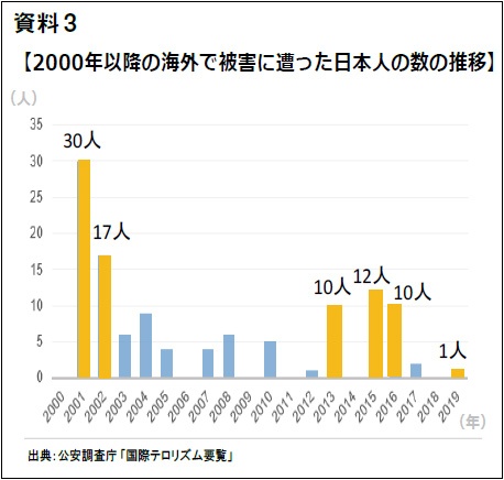 資料3に海外で被害に遭った日本人の数の推移をまとめた。コンスタントに日本人の方が亡くなっているのが分かる。ISILは、「対ISIL有志連合」を「十字軍連合」と位置付け、わが国をその一員と名指ししている。過去には、日本を含む60以上の国や機関などを列挙した上でインドネシア、マレーシア、ボスニア・ヘルツェゴビナにある日本の在外公館に対し攻撃を行うよう呼び掛けたように、日本人が狙われていることは明白(資料4)。また、大規模イベントはISILにとって格好の標的になり得る。実際ISILは、犠牲者を最大化するための凶器として、トラックなどの車両を使用し野外の大規模イベントなどを標的とするよう呼び掛けている。日本では、2020年に東京オリンピック・パラリンピック競技大会が予定され、世界中で日本への関心が高まっている。そのためわが国のみならず、在外の日本人も注意が必要になっている。
