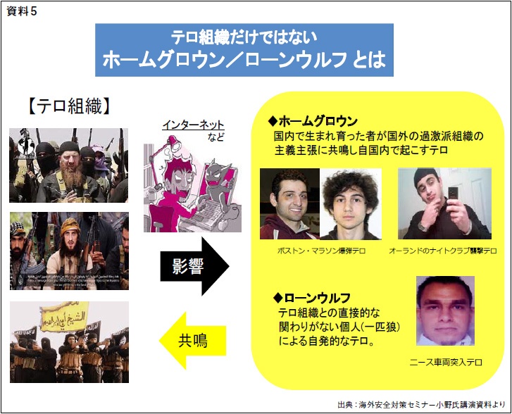 最近ではテロ組織に属さない新しいテロリストが生まれている。「ホームグロウン」と「ローンウルフ」の二つである(資料5)。ホームグロウンは国内で生まれ育った者が国外の過激派組織の主義主張に共鳴し自国内で起こすテロのことである。米国のボストン・マラソン爆弾テロやオーランドのナイトクラブ襲撃テロがそれに当たる。ナイトクラブ襲撃テロの犯人はニューヨーク生まれの米国育ちでテロ組織とは直接接触を図る機会はなかったが、インターネットなどの影響を受けテロ組織の思想に共鳴した結果犯行に及んだといわれている。ローンウルフはテロ組織との直接的な関わりがない個人(一匹おおかみ)による自発的なテロである。仏ニース車両突入テロがそれに当たる。