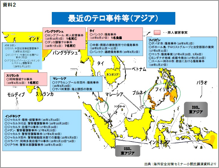 資料2を見ていただくと東南アジア全体でテロが起きていることが分かる。なぜ東南アジアが狙われるのか。東南アジアにはISILの「東アジア州」(フィリピン南部やインドネシアなど)とされる地域がある。ISILは全体では活動地域を縮小させる一方、「東アジア州」への「ヒジュラ(移住)」を奨励し、各地でのテロ実行を呼び掛けている。東南アジアにおける帰還外国人戦闘員の数は2018年時点ですでにインドネシアに86人、マレーシアに11人いるとのデータがある。また、ロレンザーナ・フィリピン国防相が少なくとも100人の外国人メンバーがすでにフィリピンに潜入し、南部を中心に活動していると述べたとの報道もあり、複数のテロ集団がISIL「東アジア州」の下に結集しているともいわれている。その結果、フィリピンでは自動車爆弾テロ、インドネシアでは「家族テロ」などが起こっている。