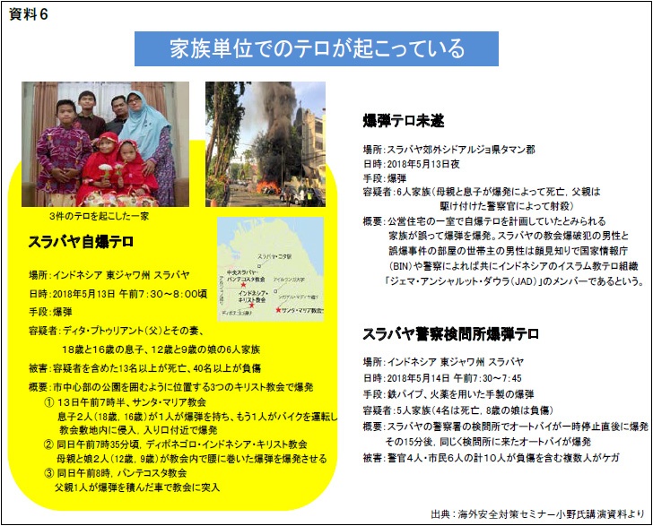 また、家族単位でのテロも起こっている(資料6)。この形態はいままで全くなかったものであり、非常に衝撃的なテロである。特徴の一つは一家全員が連続したテロ事件を分担して起こしていること。もう一つの特徴は教会や警察の検問所を狙うなど政府にとってダメージの大きい施設を標的にしたこと。この事件から警察の検問所には近づかないなどの教訓を引き出すことができよう。このように国際的なテロの傾向を知ることは私たちの身を守るために非常に重要なのである。