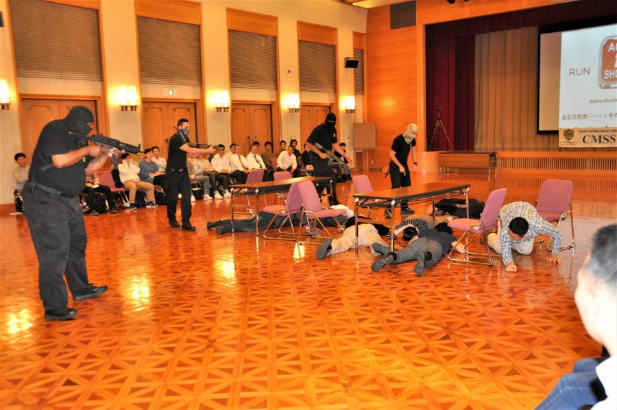 パワーポイントでの説明と事件映像を交えての座学と、外国籍の退役軍人のデモンストレーションを踏まえた場面ごとのテロ実地訓練が行われた。止血体験や心臓マッサージ体験も盛り込まれ、現場でどう行動するか身をもって学ぶことができる。