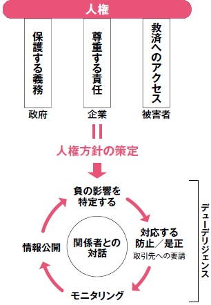 2011年、国連人権理事会で「ビジネスと人権に関する指導原則」が作られました。①人権侵害から保護する政府の責任、②人権を尊重する企業の責任、③救済へのアクセス、という3本柱のもと31の原則があります。企業には人権方針を策定し、デューデリジェンス(DD)と呼ばれる調査を回すことが求められています。