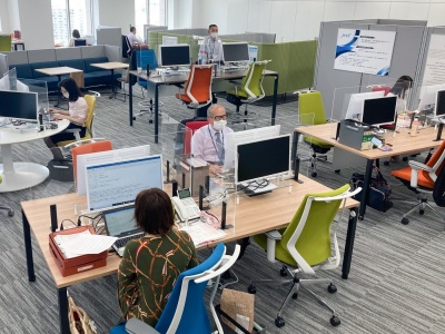 ABWを意識した執務スペース、受付横の交流スペースは、来会された会員や当会職員の一層の交流を促す設計となっています。会員の皆さまと交流できる日常が一日も早く戻ることを願いつつ、今は出勤率を抑え、我慢の時期を乗り切る所存です。