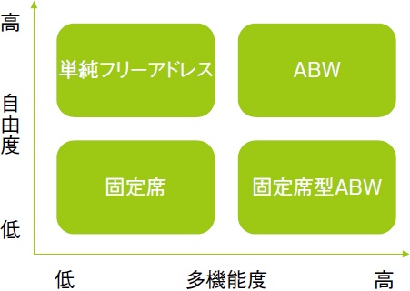 残りの二つは大きくABWに分類されるものである。このうちの一つは「固定席型ABW」で、各人に自席がある一方、自席を離れて集中ブースやカフェ、協業スペースなどを利用することもできる。最後の一つは「ABW」で、自席がないものの、業務に適した多様なスペースが用意され、業務に合わせて本当に自由に場所を選んで仕事をすることができる。