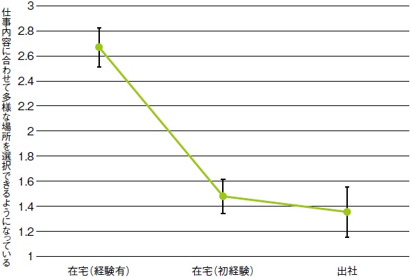 注) コロナ禍以前より在宅勤務経験有、コロナ禍で初めて在宅勤務を経験、出社勤務の3群に分けて比較。在宅(経験有)群で、オフィスが仕事内容に合わせて多様な場所を選択できるようになっていると回答している人が多い。