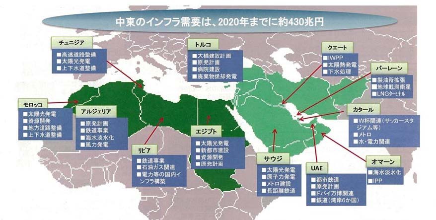 もちろん、従来から日本の存在感があった高度なインフラへの需要もさらに高まっている。特に、人口増によるエネルギー需要の肥大化や慢性的な交通渋滞に悩まされる湾岸産油国は、競って「メトロ」の導入を急いでいることから、運行の正確さや効率性において世界一であるわが国の都市交通システムに強い憧れを持っている。また、原発や省エネルギー技術についても、原油の国内消費を減らすことで歳入を増やし再分配のレベルを維持するという政治的な文脈から、極めて関心が高い。