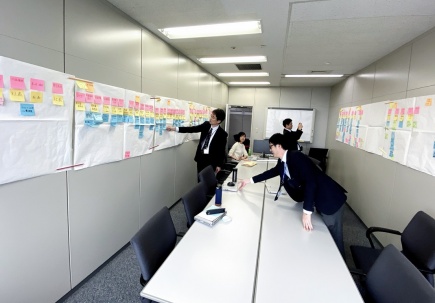 田中:オンラインとオフライン両方の働き方で多くの気付きを得ました。USMを使った要件定義はこのプロジェクトの要であり、今考えても対面で取り進めることがベストだったと思います。手を動かしながら直接コミュニケーションを取ることでプロジェクトの目標へ目線を合わせることができました。オンラインの強みは効率性にあります。このプロジェクトは途中で納期が8 ヵ月に短縮されましたので時間がありませんでした。オンラインでベンダーと打ち合わせをしていくうちに、実は移動時間を開発等に充てた方が効率良くプロジェクトが進むことに気が付きました。高い頻度で多くの会議ができるオンラインのメリットも実感しました。ベンダーとの打ち合わせ後は、すぐに社内チームメンバーだけでラップアップを行い、次のアクションを決めました。