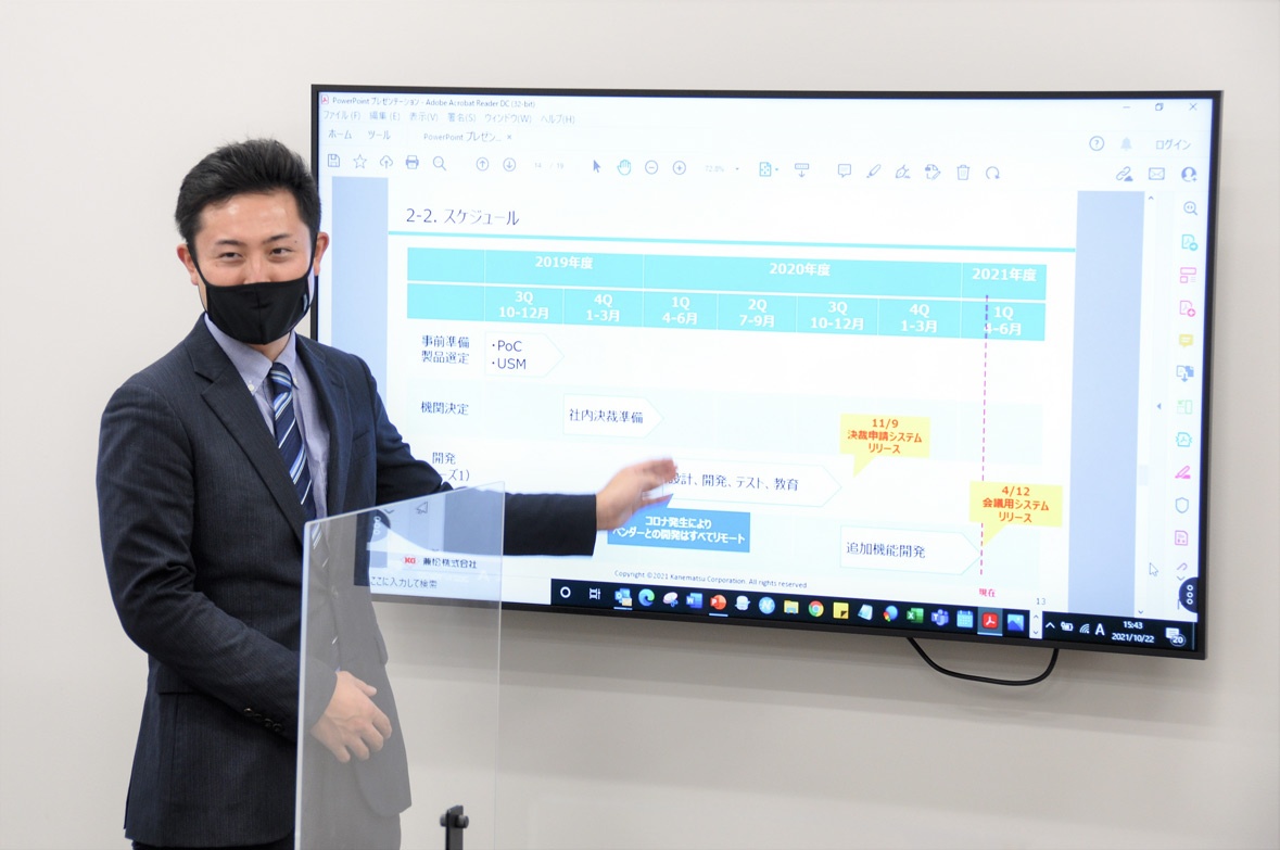 田中:2020年4月にベンダーが決まった直後に新型コロナウイルス感染症が急拡大しました。ベンダーの担当者とはキックオフで対面して以降、リリースまで全てオンラインで進めました。多くの社員が出社できなくなりましたので、2日間の突貫で暫定オンライン決裁申請システムを制作してみましたが、最低限の機能で作業効率が悪いため可及的速やかに正式な決裁申請システムを開発しリリースしなければならない状況になりました。当初は2021年4月をリリース目標時期に設定していましたが、5 ヵ月前倒しの2020年11月に変更となりました。システム開発期間は8 ヵ月でした。当初は完成度の高いシステムを開発して小規模のトライアルで動作を確認後、順次社内に広める方法を計画していましたが、基本的な機能を実装して全社にリリースする方法に変更しました。応用機能等はリリース以降に開発でき次第、実装していく追加方式としました。USMで要件定義を行っていたため、実装すべき機能の優先順位を自然と理解していたことも短納期を実現できた大きな要因の一つです。