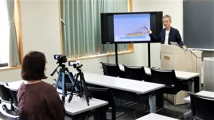 配信用ビデオ収録の様子(左 大学関係者、右 ABIC伊東講師)