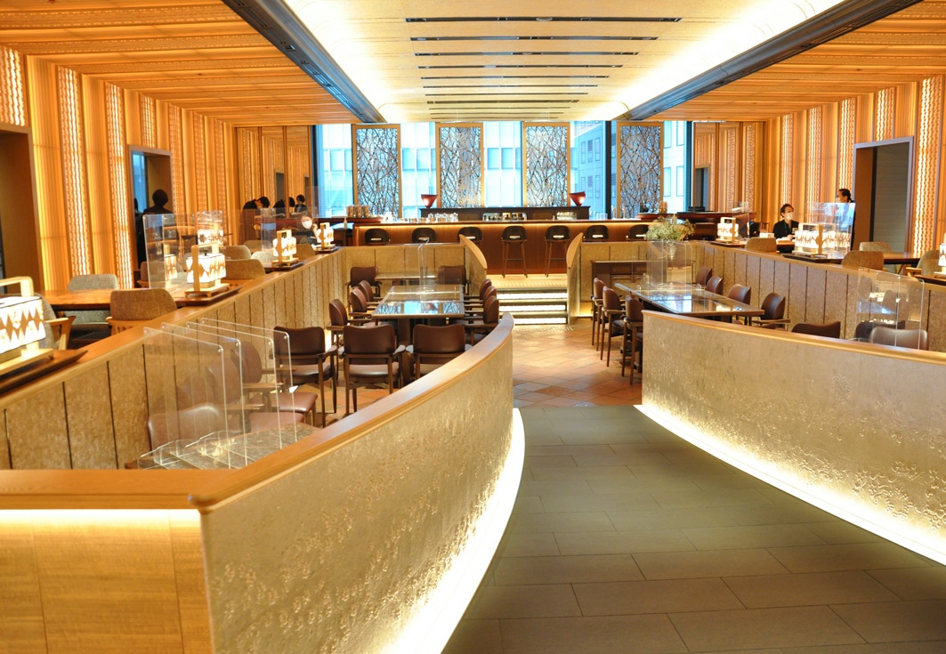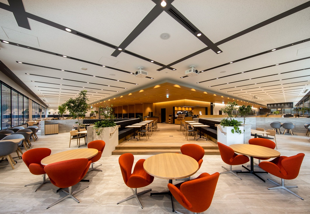 来客食堂のPremium Dining「四季咲」は一般の社員でも利用することができ、国内外のお客さまとの会食などを行えるよう、豊かな日本の四季や自然を感じられる、伝統的な素材や和のおもてなしを意識した空間となっている。