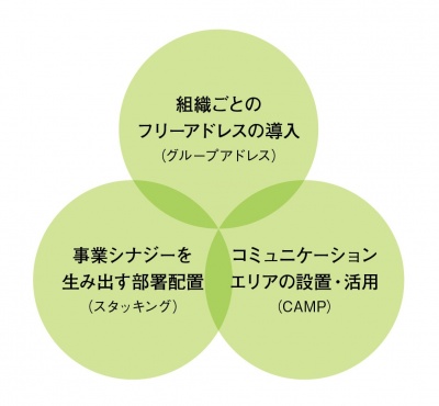新本社の執務フロアでは、七つの施策のうち、「組織ごとのフリーアドレスの導入(グループアドレス)」「事業シナジーを生み出す部署配置(スタッキング)」「コミュニケーションエリアの設置・活用(CAMP)」を三位一体で展開している。タテ組織の高い生産性を維持しながら、部門を超えた機動的なチーム編成、情報・アイデアの共有、新たなアイデアを生むコミュニケーションなど、ヨコ・ナナメとの連携を強化し、さらなる成長加速を目指す。