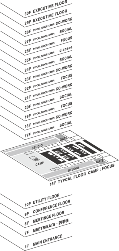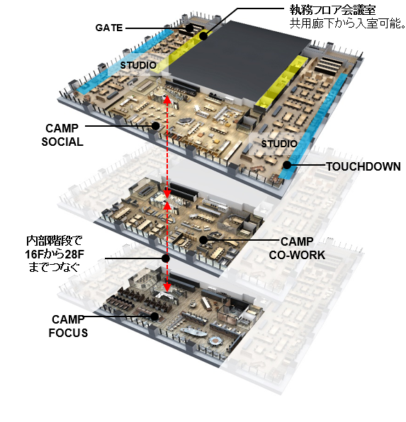 16−28階が執務フロアとなっており、3種類のCAMP「CO-WORK」「SOCIAL」「FOCUS」)(後述)が1フロアごと繰り返して縦に並ぶ構成(25階のみデジタルの専門人材が集まる「d.space」)となっており、業務アクティビティに応じて主体的に場所を選ぶ働き方(ABW= ActivityBased Working)を実践できる環境となっている。