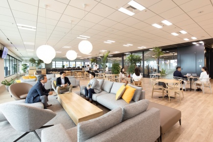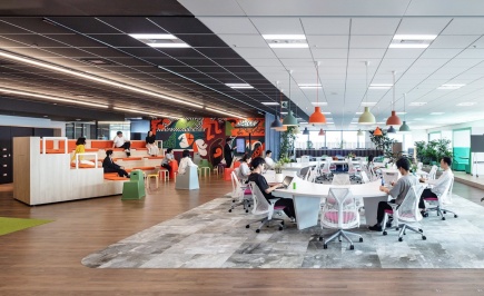 戦略的に社外パートナーを内部に招くことにより、多様な人材とのより多くのコラボレーション機会を促進している。壁をつくるのではなく、各人のストラップの色で使用可能なエリアをゾーニング。