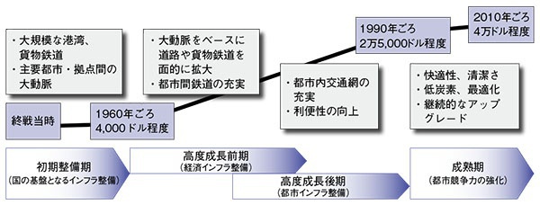 この段階に入ると、インフラを国全体に面的に整備することによる経済成長への貢献は低くなってくる。それよりも、経済成長の中心となる都市の利便性を高めることが重要となる。そこで重要性を増すのが、地下鉄等の都市内鉄道の充実であり、道路ネットワークの改良、海外と連結する国際空港の機能向上などである。