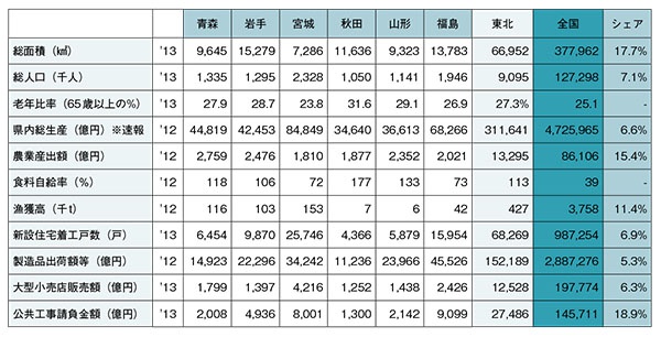 東北は、面積では約6万7,000㎢あり、これは全国比18%を占める。人口は約910万人で日本全体の7%を占める。GDPは31.2兆円で、これは全国比で6.6%。ただし、6.6%といっても震災後の数値であり、震災前は6%であった。震災後は東北のGDPも全国比で伸びており、東北の公共工事が全国の18.9%を占めているということは、いかに国の予算が手厚く東北に投下されているかを示している。公共工事の請負金額も、2013年度には2兆7,000 億円まで増えている。震災前は約1兆円の水準であったことから、2.5倍から3倍程度の公共工事によって東北経済の活性化を図っている姿がうかがえる。実質経済成長率も、全国平均が2012年に0.7%とある中で、東北だけを見ると5.3%であることから、大変高い伸びを示していることが読み取れる。1人当たりの県民所得は、宮城県は全国平均の275万4,000円に限りなく近いレベルに達しているが、その他の県については残念ながら大きく下回っている。