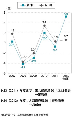 被災3県(宮城、福島、岩手)の復興状況については、各県とも将来ビジョンを描いてさまざまなことに取り組んでいる。例えば宮城県では復旧期、再生期、発展期と3段階に分けてメリハリのある取り組みをしているが、2014年は再生期の初年度として、将来に備えた「種まき」を進めている。医学部の新設、広域防災拠点の整備、放射光設備、仙台空港の民営化など積極的だ。また、東北に大きな影響を及ぼすであろう「国際リニアコライダー計画」(ILC)も岩手県中心に誘致に熱心だ。大きな問題であった津波によって被災した沿岸部の復興であるが、これは岩手県、宮城県を中心に沈下した地盤のかさ上げにもようやくめどが付きつつあり、水産加工業を中心に工場再建も徐々に各地で始まっている。