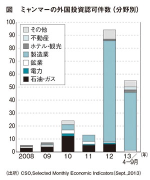 このように、ミャンマーの改革において課題は山積している。しかし、繰り返しになるが、テイン・セイン政権の改革の最大の成果は、国際社会との関係を改善し、グローバル経済へ再参入し、経済成長を追求する国際環境を整えたことである。このインパクトは過小評価すべきではない。一つの事例として、外国投資の受け入れ件数の推移を紹介しよう(図)。2012年度(4-3月)以降、認可件数が大幅に増加していることが分かる(ただし、認可金額で見た場合、2010年度、11年度に比較して、12年度以降は減少している。これは中国、タイなど近隣諸国による資源開発案件が少なくなったためである)。そして、最大の受け入れ分野は製造業である。テイン・セイン政権の改革の結果、欧米の制裁が大幅に緩和・解除され、外資にとってもミャンマーは生産拠点として視野に入ってきたのである。