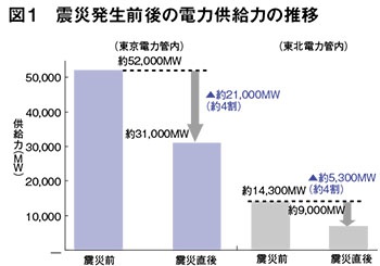 また、発電所は太平洋側を中心に広範囲で被害を受け、東京電力、東北電力管内でそれぞれ約4割の電力供給力が失われました(図1)。