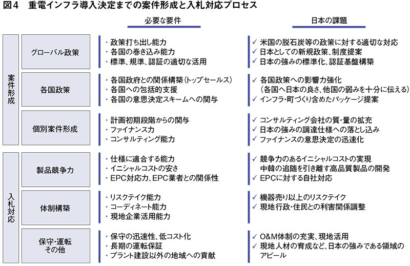 重電インフラの輸出促進のためには、膨大なアジア市場において、欧米中韓との競争に勝っていくことが求められる。重電インフラの導入が決定されるまでには、大きく分けて、案件形成プロセスと入札対応プロセスが存在する。図4に各プロセスにおける案件獲得に必要な要件と、日本の課題について整理した。