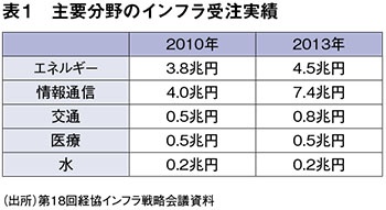 インフラ受注実績は、世界的なインフラ需要の増大の追い風の影響も受け、2010年の約10兆円から2013年の約16兆円と目標達成に向けて順調に進捗している(表1)。中でもエネルギー関連の受注額は情報通信に次いで大きなものとなっている。
