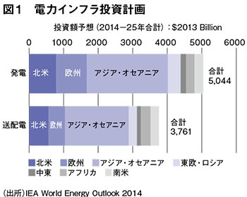 世界の電力インフラに対しては、2014年から2025年の間に発電分野(再生可能エネルギー、原子力含む)で約5兆ドル、送配電分野で約3.7兆ドルの設備投資が行われると推計されている。市場の中心はアジア・オセアニアであり、全体の5割弱を占める。その中でもやはり中心となるのは中国である。アジアは距離的に近く、ASEANを中心として比較的日本のプレゼンスが高い地域である。アジア市場をいかに攻略するかがインフラ輸出促進のカギとなる。