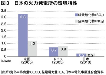 また、環境規制の影響もあるが、日本の火力発電所のSOx、NOx排出量は米国の10分の1以下、欧州の3分の1以下で、クリーンな環境を実現している(図3)。