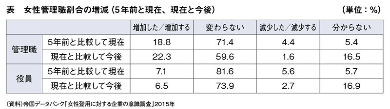 帝国データバンク調査による、自社の女性の割合に関して5年前、現在、今後の変化をみる設問では、女性管理職割合が5年前と比較して現在「増加した」と答えた企業は18.8%、現在と比較して今後「増加する」は22.3%となった。「変わらない」が多いものの、管理職登用の動きは拡大する見通しだ(表)。
