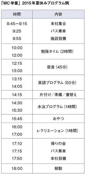 プログラムの流れですが、朝、親子一緒に本社まで通勤し、集合後、子どもたちはバスで最寄りの提携施設に向かいます。午前中は勉強し、食堂での昼食を挟んで、午後は英語やプールなどのプログラムで過ごし、夕方再びバスで本社まで戻り、親と合流後、解散となります。