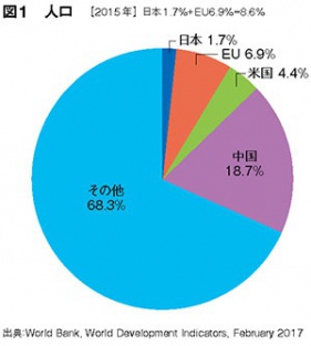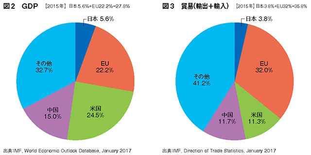 また、グローバル経済の中では、日EU・EPAが発効すれば、世界人口の約1割、GDPの約3割、貿易総額でも約3割(EU域内を除くと2割)を占める巨大な自由貿易圏が誕生することになる。日本EU・EPAを通じた両経済圏のさらなる経済成長を通じて、世界経済全体の発展が期待されるとともに、世界の貿易投資ルール作りの先導役となることが期待される。