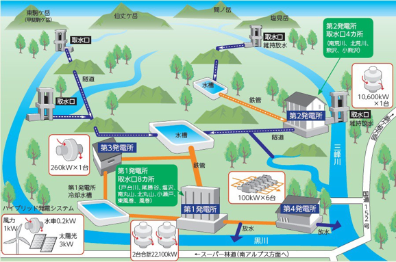 三峰川発電所の歴史は古く、1963年にまず第2発電所、1964年に第1発電所が完成し、第1は約260m、第2は約330mの落差を利用して、最大約3万2,700kW規模の発電事業を続けています。2000年からは、小水力、バイオマス、風力などの新エネルギーによる事業展開を目指した研究開発を進めており、小水力発電により、2006年に第3発電所、2009年に第4発電所が完成しました。いずれも完成時にはRPS(Renewable Portfolio Standard)法対象電源に認定されており、現行は2012年7月より開始したFIT制度における再生可能エネルギー発電設備に認定されております。その後、2011年には蓼科発電所、2012年には山梨県北杜市に3ヵ所の小水力発電所を完成させ、今後も積極的に取り組んでいきます。