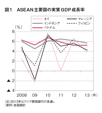 近年の経済動向を見ると、2009年はリーマン・ショックによりタイ、マレーシアでマイナス成長となったが、2010年以降は、洪水の影響で落ち込んだタイを除き、総じて安定成長が続いている(図1)。