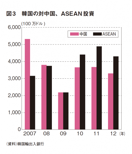 このように、ASEAN地域は今後も域内外企業による投資とそれによる貿易の拡大が期待でき、高い成長ポテンシャルを有している。韓国の対外直接投資を見ると、2010年以降ASEAN向け投資が中国向けを上回っている(図3)。2012年は上位10ヵ国の中にインドネシア、フィリピン、ベトナム、マレーシアの4ヵ国が入るなど、ASEANに向かう動きが強まっている。