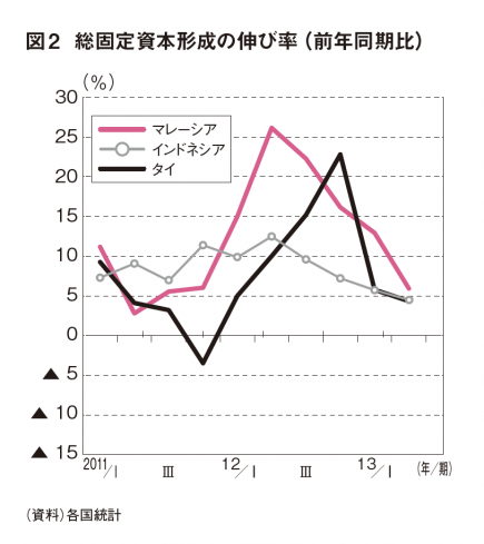 インドネシアでは2011年に1人当たりの名目GDPが3,000ドルを超えた。消費者金融の発達とインフレ抑制を受けた金利水準の低下にも支えられて、自動車販売台数が2011年、2012年に2桁の伸びを記録した。次に、投資の拡大には、内外需の増加を背景にした企業の能力増強投資、インフラ関連投資、新たなビジネスチャンスを捉えた投資が寄与している。