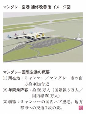 三菱商事は、株式会社JALUX、在ミャンマー企業SPA社との3社コンソーシアムにて、2013年8月、ミャンマー政府より、ミャンマーのほぼ中央に位置するマンダレー国際空港の補修・改善、および30年間の運営事業に係る優先交渉権を受領しました。