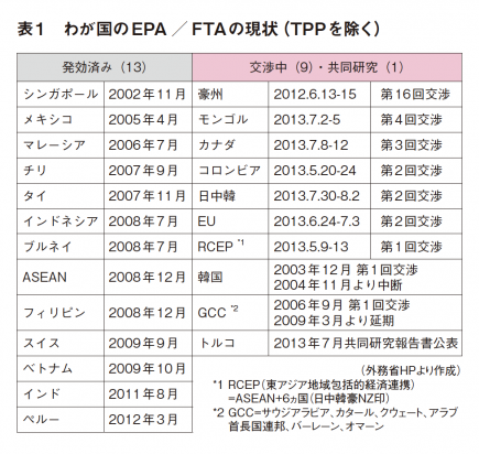 安倍政権では、「日本再興戦略~ Japan is Back」における国際展開戦略として、TPP、RCEP(東アジア地域包括的経済連携)、日中韓FTA、日EU・EPAなどの経済連携を積極的に推進することで、新興国等の成長を最大限に取り込むことを重要な施策の一つとして掲げている。具体的には、貿易額に占めるFTA比率を現在の19%から、2018年までに70%に高めることを目標に、アジア太平洋地域の新たなルールを作り上げて、TPPとともにRCEPや日中韓FTAといった広域経済連携と併せ、その先にあるより大きな構想であるFTAAP(アジア太平洋自由貿易圏)の構築