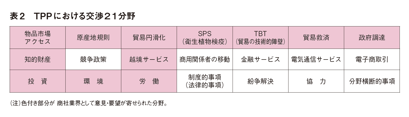 アンケート結果より商社業界の要望・課題が浮き彫りとなった。TPP交渉分野21分野中12分野に対して多くの意見が寄せられ【表2】、特に「物品市場アクセス」、「貿易円滑化」、「投資」に係る要望・意見が多くあっ た。主な要望内容は以下の通り。
