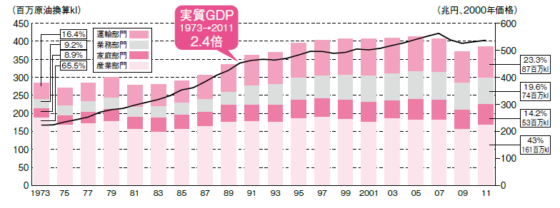 省エネルギーに関しては、1980年前後の石油危機以降、日本においてエネルギー効率(エネルギー供給/GDP)は4割改善している。しかしながら、同期間、産業部門はエネルギー消費量が減少したが、住宅・ビルのエネルギー消費量は2.5倍に増加しておりこの分野での省エネを進めることが課題である。