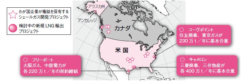そこで、具体的な例として、シェールガスの生産拡大により天然ガスの国内価格が低下している米国から新たにLNGを輸入することが、LNGの量的確保と輸入価格の引き下げを両立するために極めて有効な方策の一つである。米国からのLNG輸出には米国政府の許可が必要であり、日本企業が関与する現地プロジェクトでの日本への輸出の早期承認に向け、日本政府として米国政府に積極的な働き掛けを実施している。FTA締結国向けは自動承認されるが、非FTA締結国向けはプロジェクトごとに審査する仕組みであるため、現在申請中の3件(図2参照)のプロジェクトは、2013年2月下旬以降、審査される見込みとなっている。