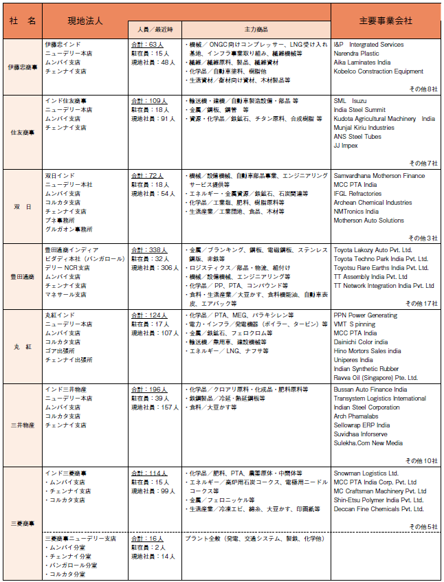 インド法人が期待される役割・機能には2つある。1つは本社の営業部門の戦略を実行するために現地側が果たす役割・機能(支援、調整業務)である。もう1つが、地域発信型の新規案件組成への取り組み機能であり、この機能が極めて大きい。従って、インド法人の組織もこれに伴い、既存のビジネスを実行する部隊と、市場開発など将来のビジネスモデル構築へ向けた活動を行う部隊の大きく2グループ化している。また、地域的な特色もあり、ニューデリー本社は、機械部門(自動車関連、インフラ)とエネルギー金属部門(鉄鉱石、石炭)、ムンバイ支店は化学部門、チェンナイ支店は生活産業部門(工業団地開発、物流サービス)、コルカタ支店は機械部門(製鉄プラント)という大きなくくりができつつある。