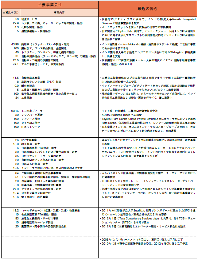 当社の自動車ビジネスは、 1980年代初頭にスズキさんがインドに進出された時、自動車部隊がそのお手伝いをするために一緒に進出したことにさかのぼる。以来、自動車と二輪車のバリューチェーンの中で、さまざまな事業を展開している。スチール加工センターのIndia Steel Summit Private Limited、造管事業のANSやASPI等の事業会社を持ち、また自動車部品製造のMunjal Kiriu Industries、トラックやバスの商用車製造・販売のSML Isuzuにも出資し、商社ではあるがものづくりにも参画している。さらに、スズキ関連の直営サービス会社のJJ.Impexにも出資し、素材から部品、完成車、サービスと幅広いビジネスを行っている。これらに加え、インドで最も歴史のある特殊鋼メーカーのムカンド社と自動車向け特殊鋼の二次加工製品の製造・販売会社を 2012年中に設立予定である。一方、当社の駐在員は、自動車はもとより金属、インフラ、化学品、資源、物流関係の部隊からも派遣されており、相当多岐にわたったビジネスを展開している国の1つである。