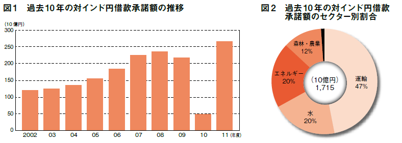 これに対しわが国はODA、なかんずく、有償資金協力(円借款)を積極的に供与し整備を支援してきた。とりわけ近年の拡充は目覚ましく、円借款承諾累計3兆円のうち6割近い1.7兆円は、直近10年間(2002-2011年度)のものである(図1)。1.7兆円の内訳は運輸分野が47%、水分野とエネルギー分野がそれぞれ20%、そして森林 ・ 農業分野が12%であり、インド政府が掲げる成長の加速および包摂的な成長という2本の柱に応えるものとなっている(図2)。