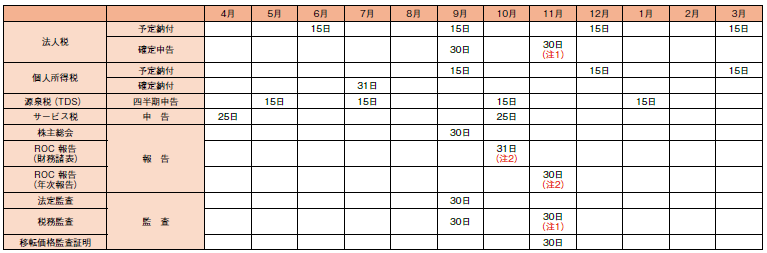 インドは、報告義務が多い国である。インド駐在の方のほとんどは、最初に大変な苦労をしているのではないだろうか。毎月何かしらの報告や申告があると思っておいた方がよいくらいである。表1のような年間スケジュールを事前に作成し、親会社、子会社の双方からけん制をかける仕組みを構築することが望ましい。誌面の都合上、全ての細かい部分には触れられないため、弊社書籍を参考にされたい。