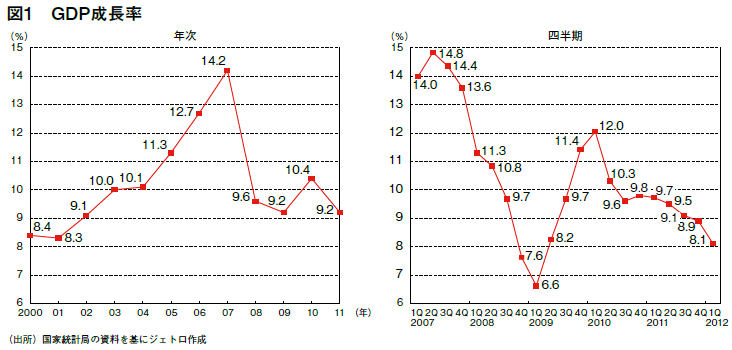 今や、中国の経済情勢には世界中が注目。経済誌が特集を組むと結論はたいてい「中国のことを悪く言いたい人が言っているほど、実態は悪くない」。現在の情勢についても専門家の見方はだいたいそのようなもの。 中国のGDP成長率は、2012年第1四半期に8.1% まで落ち込んだ。直近の四半期ごとの推移を見ると、9.1%、8.9%、8.1%と落ちてきており、このままでは7%台に推移していくというのが大方の見方であろう(図1)。その他の統計でも、4月には工業生産が2009年以来3年ぶりに1桁の伸びにとどまり、自動車販売台数の減少も見られ、景気の先行きはそれほど明るくないことを示している。今われわれの一番の関心事は、今後、中国政府が景気を下支えをするような政策を講じるのか、その余裕があるのかというところである。少なくともインフレ懸念の関連でいえば、余裕はありそう。以下具体的に申し上げる。