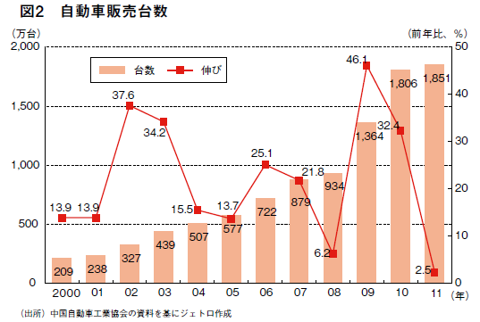 2011年における自動車販売台数は、前年比で2.5%増と伸び悩んだ(図2)。販売台数自体は1,800万台を超えており、非常に高いレベルではあるが、足踏みをした理由は、2009年、2010年に排気量1.6ℓ以下の小型車に対する減税措置を講じ、無理に消費を伸ばしたことが挙げられる。これを受けて、現在中国政府においては、このような需要の先取りに当たる消費刺激策は慎むべきとの議論が強いといわれている。
