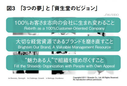 このSGLPには、社長をはじめ多くの経営トップが自ら参画し、グローバル視点での経営観、自らのリーダーシップ論など、経営視点からの示唆を教示していますが、2011年の開講時には、当研修のゴールとして次の3つが示されています。1つは、資生堂のこれまでの歴史の共有です。当社が長年にわたり育んできた、バリュー、フィロソフィー、カルチャーを共有しようとするものです。2つ目は、資生堂グループのこれからの拡大です。グローバル化に向けて、日本本社ならびにそれぞれの現地法人の抱えている課題を共有するとともに、最終セッションでは、受講者が自らの言葉で、自らの事業へのコミットメントをお願いしたいということです。そして3つ目は、参加者同士のネットワークの構築です。