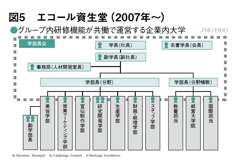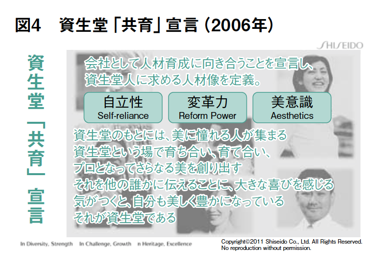 2006年には、前田前社長(現会長)が、3つの夢を発表し、その柱として「魅力ある人で組織を埋め尽くすこと」を掲げ(図3)、21世紀に通用する人づくりを目指し、「資生堂『共育』宣言」を策定しました(図4)。そして、2007年には企業内大学「エコール資生堂」を設立し、現在の人材育成への取り組みがスタートしたわけです(図5)。現在では、階層別、分野別に年間100講座以上の社員研修が行われており、社員は7つの分野のいずれかに認定され、プロフェッショナルな人材への育成に向け、各学部の学部長(各事業の役員)は、それぞれの分野に所属する社員の育成にオーナーシップを発揮し、人づくりが加速しています。
