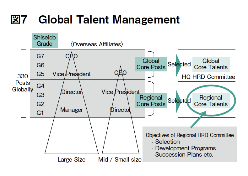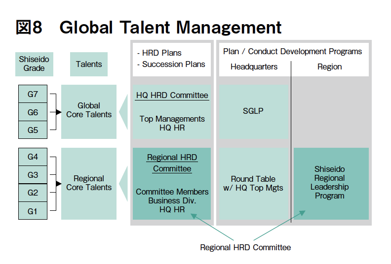現在グローバルレベルでの人材育成や人材マネジメントを進めるための体系を整え、具体的な取り組みを加速させていますが、ここでお伝えする現地法人社員を中心とする社員の育成については、まずは、これらの実現のための人材基盤としてグローバル共通の資生堂グレードの導入を進めています。資生堂グレードの導入後は、現地法人のマネジメント層を大きく2つに分け、タレントマネジメントを推進します。現地法人トップクラスは、グローバルコア人材として、日本本社の人材審議の場において、育成プログラムの対象としてフォローをしてまいります。現法副社長やダイレクタークラスについては、各地域に設立するリージョナルコミッティー(地域人材育成審議会)にて、育成計画を策定し、研修などのプログラムを実施してまいります。研修の体系は以下の図表の通りですが(図6 〜 8)、SGLP(資生堂グローバルリーダーシッププログラム)は2011年で4回目となっており、基本的には日本本社にて2回のプログラム、そして毎年5月にはスイスのIMDにて学ぶというもので、毎回現地法人の外国人に加え、日本人社員(現地法人のトップクラスおよび国内の幹部候補社員など)とを合わせた編成で推進しています。